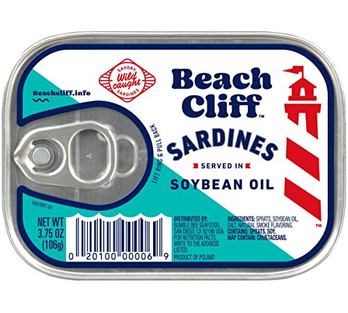 Beach Cliff Wild Caught Sardines in Soybean Oil, 3.75 oz Can – 13g Protein per Serving – Gluten Free, Keto Friendly – Great for Pasta & Seafood Recipes –