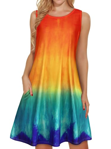 elescat Summer Dresses for Women Casual Beach Sleeveless Sundress Scoop Neck Swing Tank Dress with Pocket(Orange Blue Tie Dye, L) –