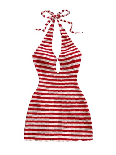 GORGLITTER Women’s Crochet Halter Bubble Mini Dress Bow Backless Summer Bodycon Knit Dress Vacation Festival Outfits Red and White X-Small –