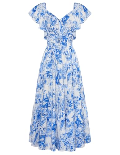 GRACE KARIN Womens 2025 Floral White Blue Flower Summer V-Neck Ruffle Sleeve Empire Waist A-Line Casual Maxi Tiered Dress with Pockets L –