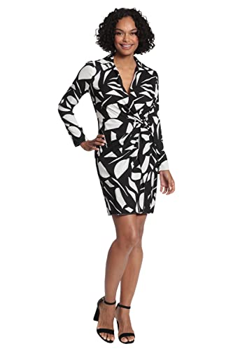 London Times Women’s Petite Geo Printed Above The Knee Faux Wrap Dress with Tie and Collar, Black/Soft White –