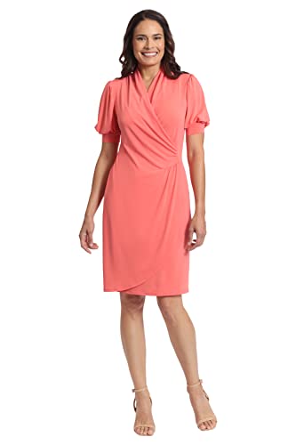 London Times Women’s Shirred Flounce Puff Sleeve Faux Wrap Dress, Dubarry Coral –