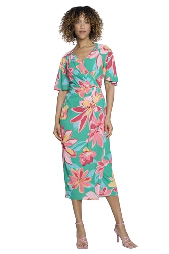 Maggy London Floral Midi Summer Women with Faux-Wrap Bodice and V-Neckline, Wedding Guest Dress, Green/Coral –