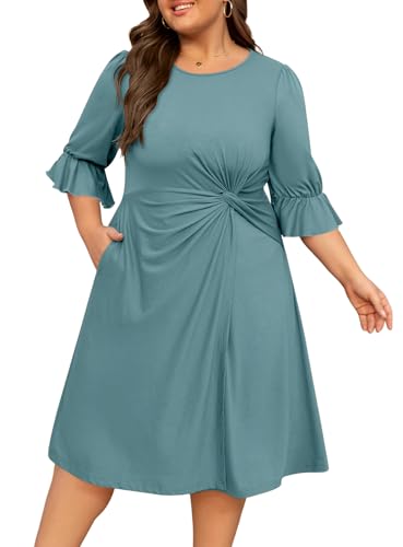 Manllenshie Women’s Plus Size Dresses Casual 3/4 Ruffle Sleeve Crew Neck Twist Knot Wrap Patchwork Slit Hem Dress with Pocket (Cyan,XL) –