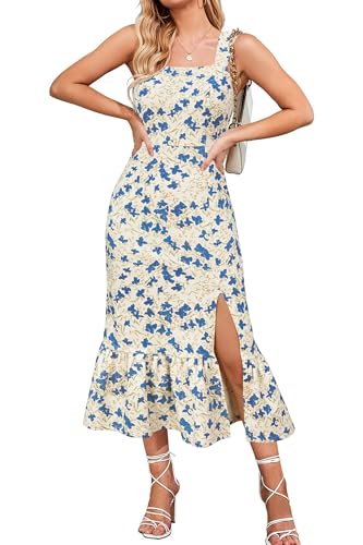 Newshows Womens 2025 Summer Beach Floral Midi Dress Spring Vacation Outfits Square Neck Ruffle Split Sundress(Blue Gardenia,L) –