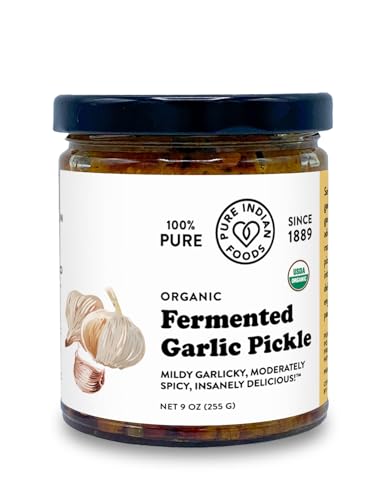 Pure Indian Foods, Fermented Garlic Pickle, (Achaar) Reslish/Spread/Condiment, Certified Organic – 9 oz –