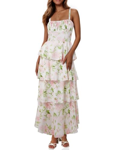 Wenrine Womens Summer Floral Maxi Dresses Sleeveless Spaghetti Strap Tie Back Ruffle Tiered Flowy Dresses –