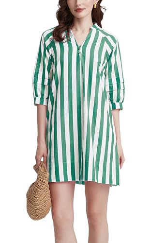 Womens Striped Mini Dress V Neck Casual Summer 3/4 Lantern Sleeves Loose Beach Tunic Shift Dresses Green –